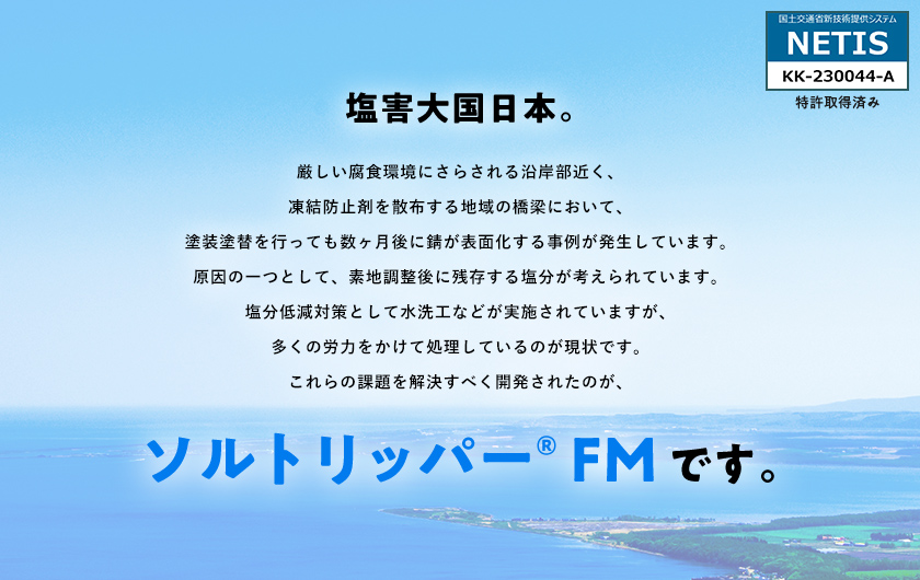 - 一般的な水洗とは異なり、鋼材表面に長く留まる事で効果を発揮します。また膜ごと塩分を取り除けるため、再汚染を防ぐことが出来ます。